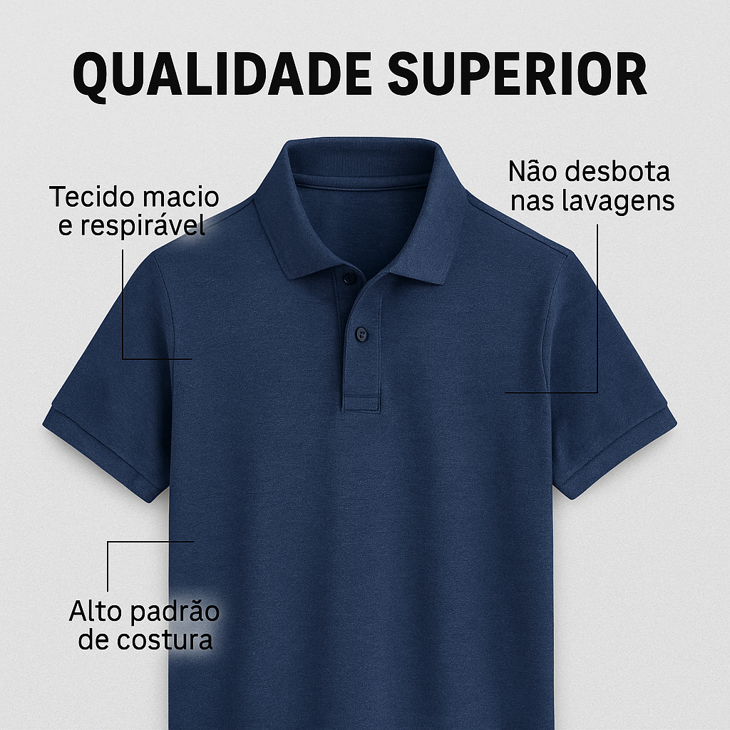 Camisa: tecido piquet premium, gola firme, modelagem padrão.